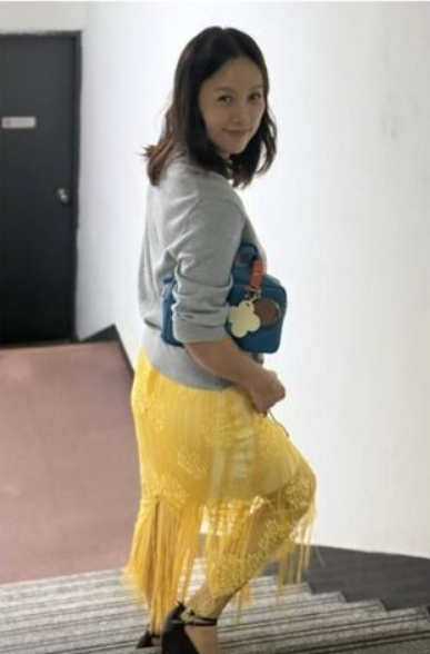 - 하의: 노란색 시스루 스커트 (무릎 아래 길이)