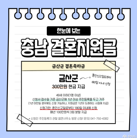 | 금산군 | 300만원 | 현금 | 49,376명 | 혼인신고일로부터 180일 이내 신청 |