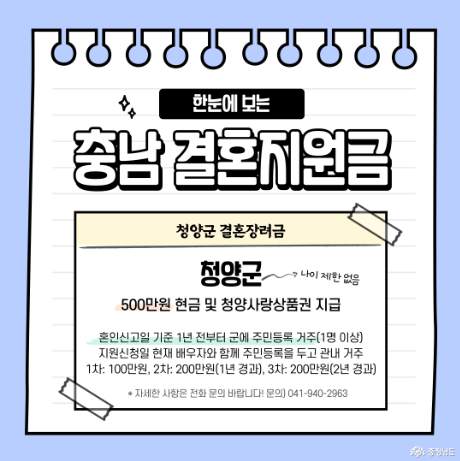 | 청양군 | 500만원 | 현금 또는 상품권 | 29,515명 | 나이 제한 없음 |