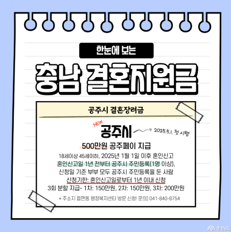 공주시 | 500만원 | 공주페이 | 100,888명 | 혼인 1년 전부터 주민등록 있으면 OK |