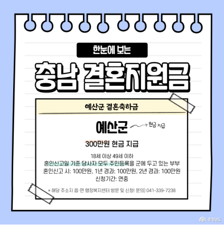| 예산군 | 300만원 | 현금 | 78,796명 | 혼인신고 후 신청 가능 |
